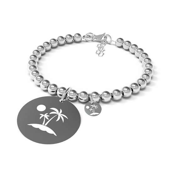 Bracciale da donna in acciaio ideato e realizzato da Anna Biblò. Il bracciale 10 Buoni Propositi è il regalo ideale per una donna che ha come obiettivo quello di procurarsi più tempo per se stessa ed è in cerca di un accessorio che possa esprimere al meglio la propria personalità, esso infatti è impreziosito da due charm ISOLA CON PALME, di cui uno con inciso il Buon Proposito "Da oggi chiudo con lo stress". Il modello B4552 è rivestito in acciaio inossidabile, possiede una misura regolabile da 18 a 24 centimetri e una chiusura a moschettone.