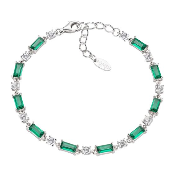 Bracciale Tennis con Zirconi Verdi Smeraldo Baguette Bracciale in argento 925 rodiato con zirconi verdi e bianchi. Lunghezza regolabile da 16 a 19 cm con catena di allungo e chiusura a moschettone. Zirconi verde smeraldo taglio baguette da 6 mm si alternano a zirconi bianchi tondi da 3 mm