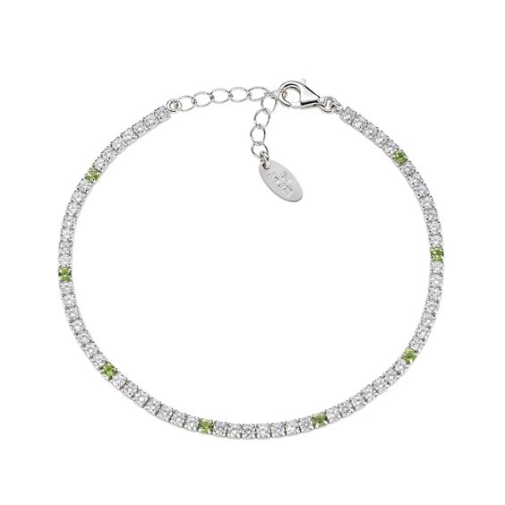 Bracciale Tennis con Zirconi Verde Oliva e Bianchi Bracciale tennis in argento 925 rodiato con zirconi verdi oliva e bianchi da 2 mm. Lunghezza regolabile da 16 a 19 cm con catenina di allungo e chiusura a moschettone