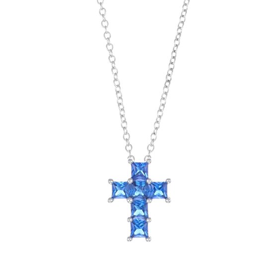 Collana Croce di Zirconi Blu Collana in argento 925 rodiato con croce di zirconi blu taglio carré. Lunghezza regolabile da 38 a 42 cm con chiusura a moschettone. La croce è lunga 1,1 cm.
