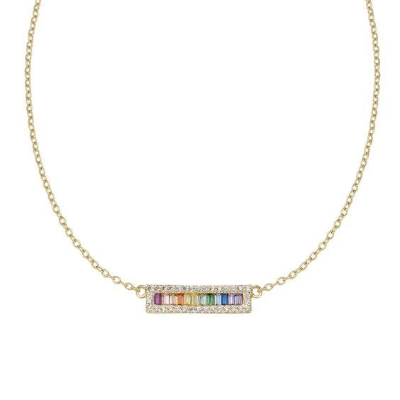 Collana Arcobaleno Dorata con Barretta di Zirconi La barretta è 1,6 cm per 4 mm. Catena con lunghezza regolabile da 40 a 45 cm, chiusura a moschettone.