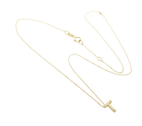 Collierino og brill. 9kt- lettera T Collezione: Bl joy letter olore Oro: Oro giallo Oro: 0.85 gr. Tipo Pietra: Diamante Taglio pietra: Rotondo Caratura: 0.003 Colore Diamante: GH