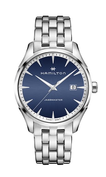 Orologio Hamilton della collezione Jazzmaster. Orologio da polso con movimento al quarzo e quadrante da 40mm. Semplice ed elegante con bracciale e cassa in acciaio, il tutto in contrasto con il blu del quadrante.
