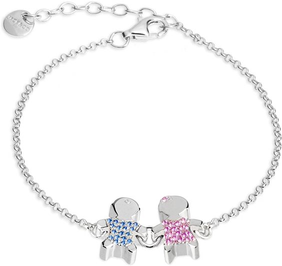 Bracciale in argento con due bimbi uno rosa e uno azzurro. Catenella finale per agganciarlo a piacere.