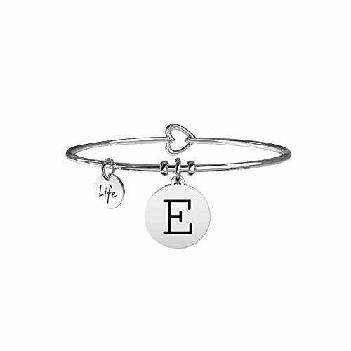 Bracciale bangle in acciaio 316L, circonferenza 20 cm, Ø 6 cm con ciondolo lettera E e cristallo bianco. Dimensioni: ciondolo Ø 17 mm, cristallo Ø 1.50 mm