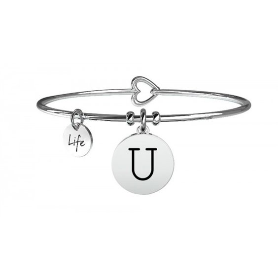 Bracciale bangle in acciaio 316L, circonferenza 20 cm, Ø 6 cm con ciondolo lettera U e cristallo bianco. Dimensioni: ciondolo Ø 17 mm, cristallo Ø 1.50 mm