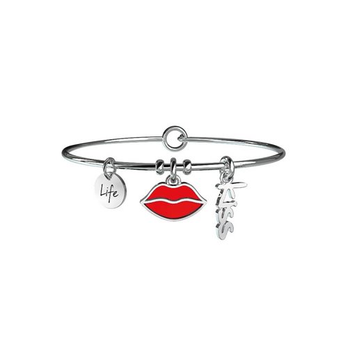 Bracciale rigido Kidult in acciaio316L ipoallergenico da donna con doppio ciondolo, uno a forma di labbra rosse e uno a forma di scritta “kiss”. “A volte solo un bacio è l’unica parola possibile.”