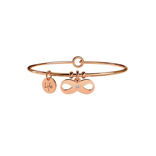 Bracciale rigido Kidult in acciaio 316L rose gold pvd con ciondolo a forma di infinito con cristallo centrale.“I sentimenti che hai dentro non si contano, come le emozioni che regali a chi ti sta accanto. Un regalo per te, che ami l’infinita bellezza della vita.”