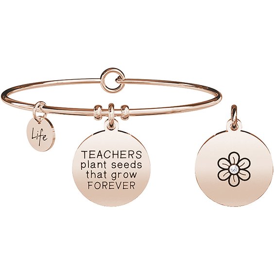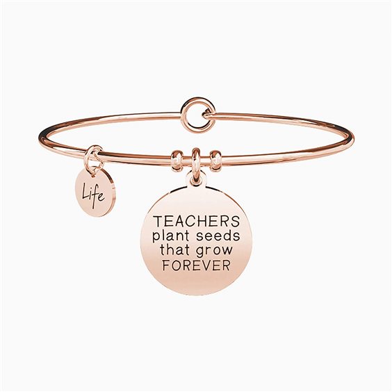 Ogni studente è un germoglio. Ogni insegnante è l'acqua che può farlo crescere per sempre. "Teachers plant seeds that grow forever" "Gli insegnanti piantano semi che cresceranno per sempre" Bangle in acciaio color oro rosa con ciondolo piastra tonda. • Incisione smaltata sul ciondolo e cristallo sul retro • Chiusura tonda • Misura unica, diametro 6 cm • Materiale: Acciaio 316L con Pvd Oro Rosa, Cristallo • Designed by Kidult in Italy