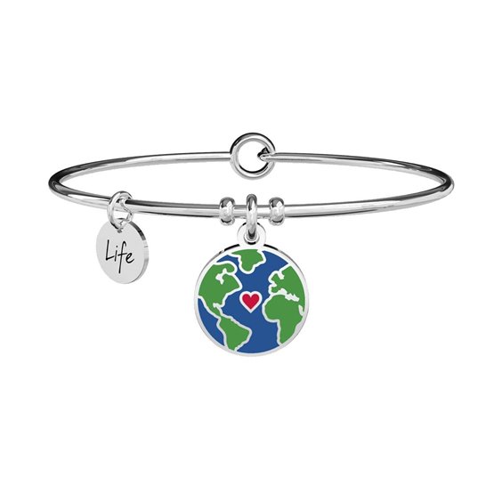 Bracciale Kidult in acciaio con pendente mondo colorato con cuoricino rosso dedicato a salvaguardare il più possibile il nostro pianeta. " Abbiamo un'unica terra, un solo pianeta, un mondo bellissimo da amare e proteggere"