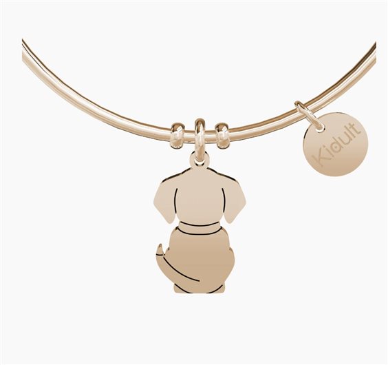 Bracciale kidult rigido in acciaio ipoallergenico colore rosè con ciondolo cane. " Cerchi qualcuno che ti sia sempre fedele, che ti segua nelle tue avventure e rispetti le tue regole? Allora tutto quello di cui hai bisogno è... un cane!"