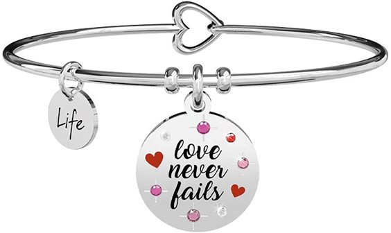 Bracciale Kidult in acciaio con ciondolo rotondo con cristalli bianchi, rosa e fucisa. Love never fails - l'amore non sbaglia mai. " lotta, credi, piangi, ridi, vivi, ama. L'amore ha sempre ragione. "
