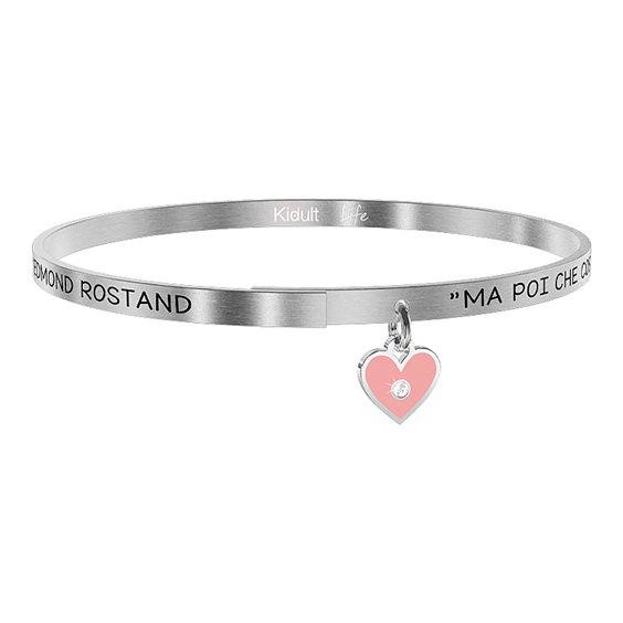 Ma poi che cos'è un bacio? Un apostrofo rosa messo tra le parole 't' amo'. - Edmond Rostand - Bangle sottile in acciaio satinato con scritta e piccolo ciondolo a cuore smaltato rosa. • Incisione smaltata; smalto colorato e cristallo sul ciondolo • Chiusura a scomparsa • Misura unica, diametro 6 cm • Materiale: Acciaio 316L, Smalto, Cristallo