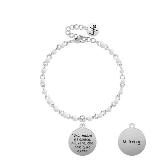 Bracciali Da Donna Di Kidult Della Collezione Family. Bracciale In Acciaio Con Ciondolo Satinato Tondo E Catena Rolò Con Inserimenti In Smalto Bianco. Incisione Smaltata Sul Ciondolo E Inserimenti In Smalto Sulla Catena. Chiusura Con Moschettone. Misura Regolabile, Lunghezza Da 16 Cm A 19 Cm. Materiale: Acciaio 316L, Smalto. Frase Prodotto: “Una Madre È L’Amica Più Vera Che Possiamo Avere”.- Washington Lrving -.