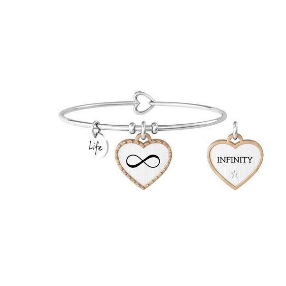 Bracciale bangle in acciaio 316L, circonferenza 20 cm, Ø 6 cm con ciondolo cuore satinato e con PVD rosé lucido, borchie. Scritta: INFINITY. Dimensioni: ciondolo 19x19 mm