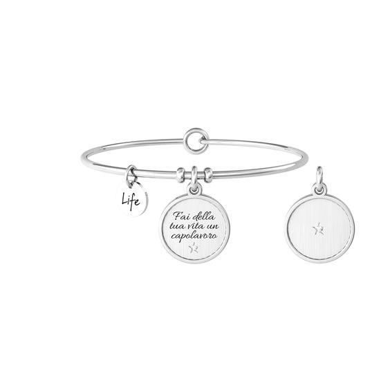 Bracciale in acciaio 316L lucido, circonferenza 20 cm e Ø 6 cm con ciondolo lucido e satinato, cristallo. Scritta: Fai della tua... capolavoro. Dimensioni: ciondolo Ø 18 mm, cristallo Ø 1.5 mm