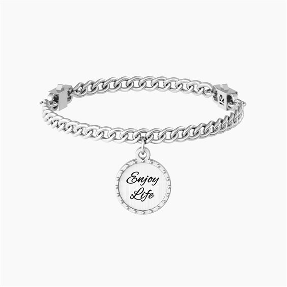 Bracciale in acciaio con catena groumette, misura regolabile grazie al sistema "comfort fit". Ciondolo tondo in acciaio satinato e bordo borchiato tono su tono. Incisione con scritta "Enjoy Life" e punto luce sul retro. Il sistema "comfort fit" permette facilmente di adattare in modo confortevole ed elegante il bracciale al tuo polso. Scegli la lunghezza della catena più adatta al tuo polso, agganciala ai due moschettoni e indossa il bracciale. • Dimensione del ciondolo: 15 mm • Diametro del cristallo: 1,5 mm • Dimensioni catena: 4.30 mm • Chiusura con moschettoni e adattamento "comfort fit" • Misura Small, lunghezza 16 cm; misura Medium, lunghezza 17,5 cm; misura Large, lunghezza 19 cm. • Materiale: Acciaio 316L, Cristallo