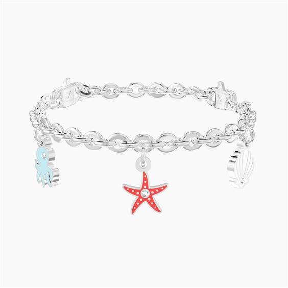 Bracciale in acciaio 316L, lunghezza 19 cm, misura regolabile sistema "COMFORT FIT" (16 cm / 17.5 cm / 19 cm), con catena forzatina, ciondoli smaltati polpo, stella marina e conchiglia, cristalli. Dimensioni: catena 4 mm, polpo 7.5x13 mm, stella marina 10
