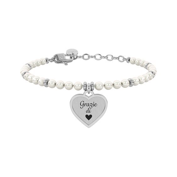 Bracciale in acciaio 316L lucido e satinato, lunghezza regolabile da 16 a 19 cm, con perle conchiglia, ciondolo cuore. Scritta: Grazie di ♥. Dimensioni: perle conchiglia Ø 4 mm, cuore 17x17.5 mm