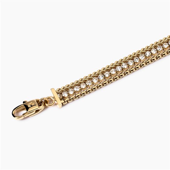 Bracciale regolabile in acciaio dorato con due catene e tennis di cristalli bianchi. • Dimensione catena franco: 2 mm • Dimensione catena veneta: 2 mm • Diametro cristalli: 2 mm • Misura regolabile, lunghezza da 15,5 a 18,5 cm • Materiale: Acciaio 316L, Cristalli, PVD giallo