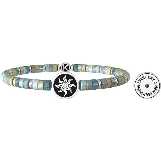 Bracciale elastico in acciaio 316L con diaspro azzurro, lunghezza 18.30/18.50 cm e ciondolo con sole e PVD nero, cristallo bianco e nero. Scritta: EVERY DAY A NEW BEGINNING. Dimensioni: ciondolo Ø 12 mm, dischetti 4.50x2.50 mm, cristallo Ø 1.75 mm.