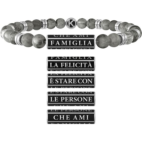 Bracciale elastico in acciaio 316L lucido e satinato con agata grigia, circonferenza 19.50-19.80 cm, elemento con PVD nero. Scritta: FAMIGLIA LA FELICITA' E'…AMI. Dimensioni: elemento 20x6 mm, sfere Ø 6 mm