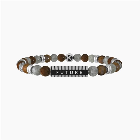 Bracciale elastico in acciaio 316L con pietre alternate occhio di tigre e agata grigia, circonferenza 19.50/19.80 cm, elemento con PVD nero. Scritta: FUTURE BEGINS EVERYDAY Dimensioni: elemento 20x6 mm, sfere Ø 6 mm