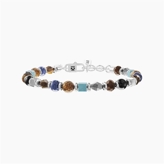Bracciale in acciaio 316L, lunghezza regolabile da 19 a 21 cm, con agata nera, sodalite blu, turchese e agata grigia striata taglio quadrato, agata grigia striata e occhio di tigre faccettati. Dimensioni: pietre 6x6.5, Ø 6, Ø6x4 e 4x4 mm