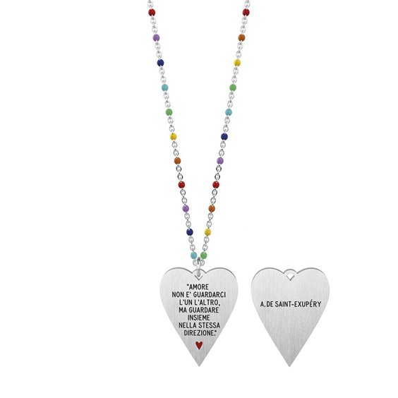 Collana lunga Kidult Amore non è… | A. de Saint-Exupéry in acciaio. Questa collana fa parte della collezione Love. Collana in acciaio 316L ipoallergenico Catena rolò con perline smaltate Lunghezza unica collana 80 cm con chiusura a moschettone Lasciati trasportare dai colori, dalle frasi e dai simpatici ciondoli dei gioielli Kidult e rivivi le emozioni del passato o lasciati ispirare e realizza i tuoi sogni. Le collane Kidult nascono con l’intenzione di raccontare una storia: la tua. “Amore non è guardarci l’un l’altro, ma guardare insieme nella stessa direzione. – A. de Saint-Exupéry“