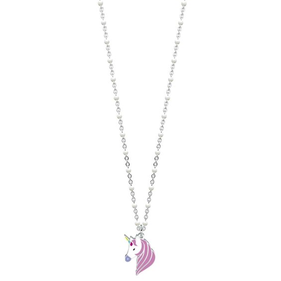 Collana Da Donna Di Kidult Della Collezione Symbols. Collana Corta In Acciaio Con Ciondolo A Unicorno E Catena Rolò Con Inserimenti di pallini In Smalto Bianco. Incisione Smaltata E Smalti Colorati Sul Ciondolo E Inserimenti In Smalto Sulla Catena. Misura Unica, Lunghezza 44 Cm. Materiale: Acciaio 316L, Smalto. Gioiello Con Frase: Continua A Sognare, Insegui I Tuoi Desideri E Come Per Magia Spiccherai Il Volo Attraverso Tutti I Colori Dell'Arcobaleno..