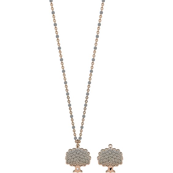 Collana Da Donna Di Kidult Della Collezione Nature. Collana Corta In Acciaio Color Oro Rosa Con Ciondolo Ad Albero Della Vita E Catena Rolò Con Inserimenti di pallini in smalto color grigio In Smalto Grigio. Incisione Smaltata E Cristallo Sul Ciondolo E Inserimenti In Smalto Sulla Catena. Misura Unica, Lunghezza 44 Cm. Materiale: Acciaio 316L Con Pvd Oro Rosa, Smalto, Cristallo. Gioiello Con Frase: 'L'Amore, Una Volta Sbocciato Mette Radici Che Non Smettono Più Di Crescere.' - A. De Saint-Exupéry -