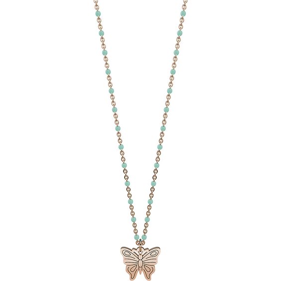Collana Da Donna Di Kidult Della Collezione Animal Planet. Collana Corta In Acciaio Color Oro Rosa Con Ciondolo A Farfalla E Catena Rolò Con Inserimenti di palline In Smalto Verde Acqua. Incisione Smaltata Sul Ciondolo E Inserimenti In Smalto Sulla Catena. Misura Unica, Lunghezza 44 Cm. Materiale: Acciaio 316L Con Pvd Oro Rosa, Smalto. Gioiello Con Frase: Ali Leggere Accarezzate Dal Vento, Spirito Libero Che Danza Nel Cielo Con I Colori Dell'Arcobaleno. Per Lei Ogni Secondo Vale Come Un Giorno. Ti Ricorderà Di Vivere Intensamente Ogni Singolo Momento..