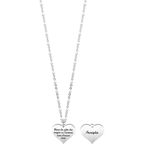 Collana Da Donna Di Kidult Della Collezione Family. Collana Corta In Acciaio Con Ciondolo A Cuore E Catena Rolò Con Inserimenti In Smalto Bianco. Incisione Smaltata Sul Ciondolo E Inserimenti di pallini In Smalto Sulla Catena bianco. Misura Unica, Lunghezza 44 Cm. Materiale: Acciaio 316L, Smalto. Gioiello Con Frase: Dove La Vita Ha Inizio E L'Amore Non Finisce Mai
