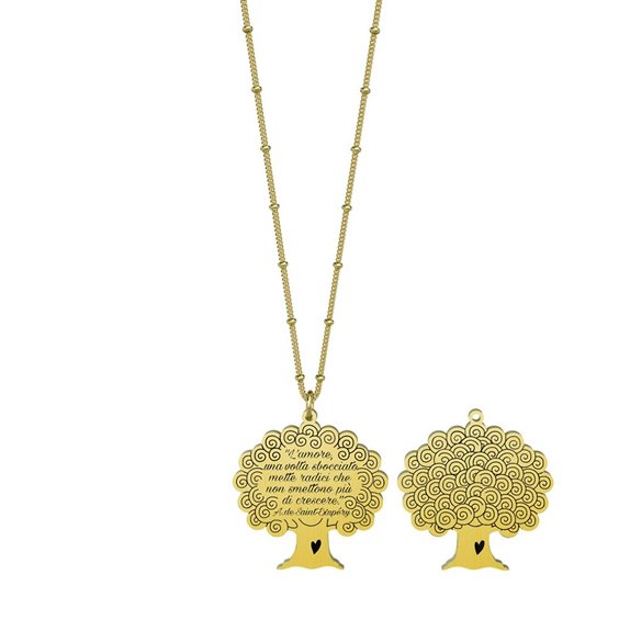 'L'amore, una volta sbocciato mette radici che non smettono più di crescere.' - A. de Saint-Exupéry - Collana lunga in acciaio color oro con ciondolo ad albero della vita e catena groumette con anellini. • Incisione smaltata sul ciondolo • Misura unica, lunghezza 80 cm • Materiale: Acciaio 316L con Pvd Oro