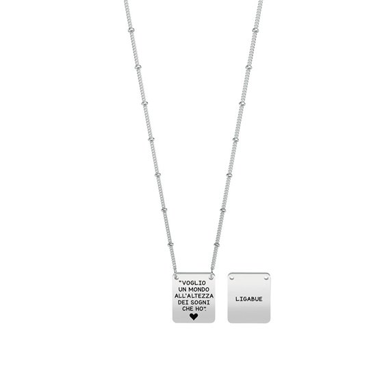 Collana girocollo Kidult Voglio Volere | Ligabue in acciaio. Questa collana fa parte della collezione Philosophy, Ligabue Official Collection. Collana in acciaio 316L ipoallergenico Catena grumetta con anellini Lunghezza unica collana 45 cm con chiusura a moschettone Lasciati trasportare dai colori, dalle frasi e dai simpatici ciondoli dei gioielli Kidult e rivivi le emozioni del passato o lasciati ispirare e realizza i tuoi sogni. Le collane Kidult nascono con l’intenzione di raccontare una storia: la tua. “Voglio un mondo all’altezza dei sogni che ho. Ligabue”