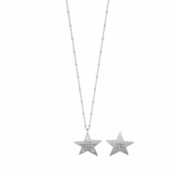 I veri sognatori non dormono mai. - Edgar A. Poe - Collana di media lunghezza in acciaio con ciondolo satinato a stella e catena groumette con anellini. • Incisione smaltata e cristallo sul ciondolo • Chiusura con moschettone • Misura unica, lunghezza 60 cm • Materiale: Acciaio 316L, Cristallo
