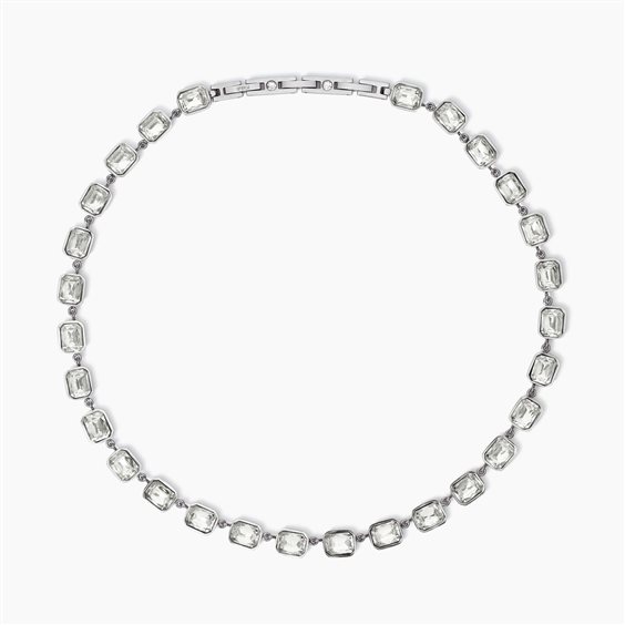 Girocollo regolabile con cristalli ottagonali bianchi taglio grande. • Diametro cristalli tondi: 3 mm • Dimensione cristalli ottagonali: 10 x 8 mm • Misura regolabile, lunghezza da 39 a 42,5 cm • Materiale: Acciaio 316L, Cristalli