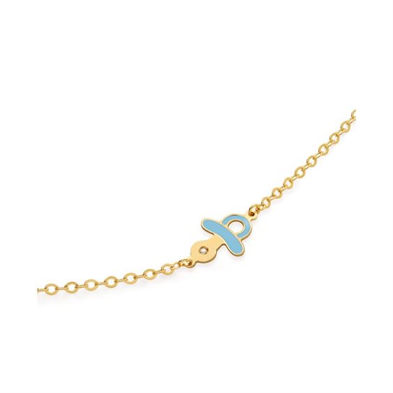 Bracciale "Lucciole" in oro giallo 9kt con ciuccio azzurro smaltato e diamante da 0,003 ct. Tutti i bracciali hanno una lunghezza di 13-15 cm.