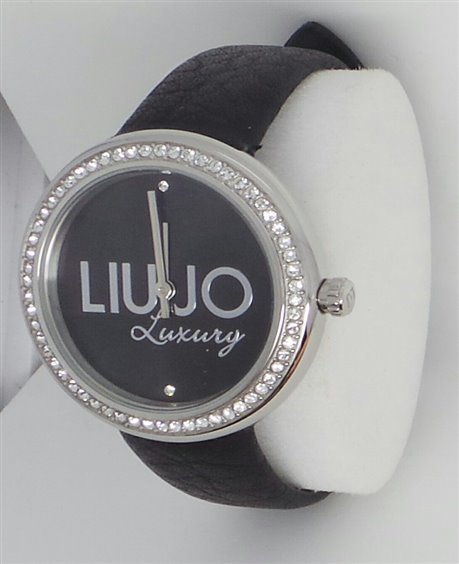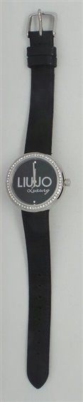 OROLOGIO SOLO TEMPO DONNA, CASSA IN ACCIAIO CON ZIRCONI SULLA GHIERA. QUADRANTE NERO CON PICCOLI ZIRCONI A ORE 12 E 6. CINTURINO IN VERE PELLE NERO OPACO.