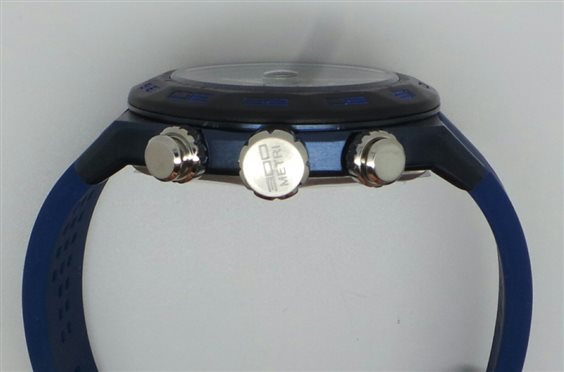 orologio in acciaio trattato pvd nero e titanio, diametro 45 mm, movimento cronografico al quarzo, vetro zaffiro, cinturino silicone con chiusura ardiglione, pulsanti e corona a vite, fondo titanio a viti, water resistant 300 m