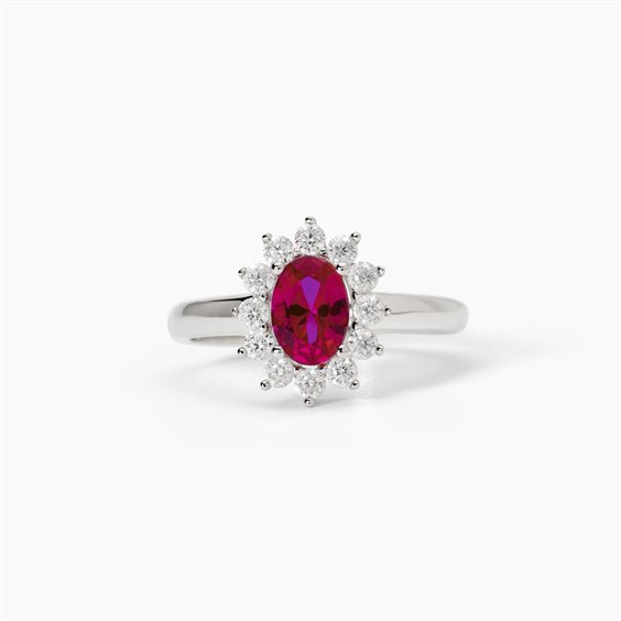 Anello da donna regolabile in argento rodiato con rubino sintetico taglio ovale e zirconi bianchi. • Dimensioni rubino sintetico: 5 x 7 mm • Diametro degli zirconi: 2 mm • Misura regolabile dalla taglia 11 alla 19 • Materiale: Argento 925, Rubino sintetico, Zirconi