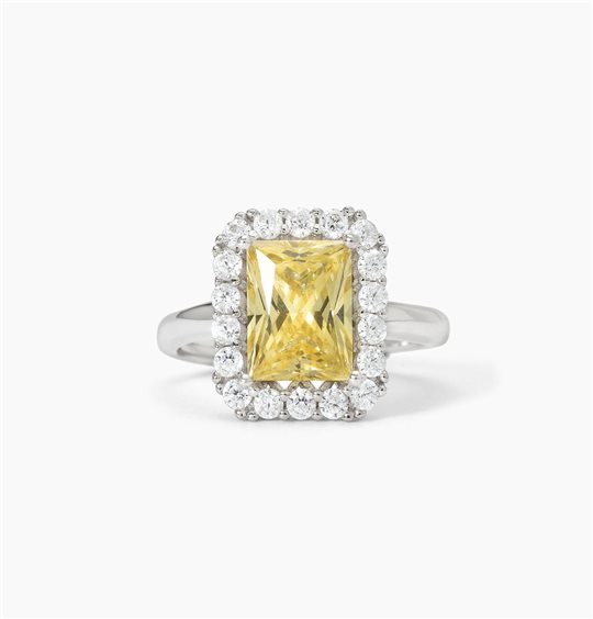 Anello da donna regolabile in argento rodiato con zircone Lemon taglio princess e zirconi bianchi. • Dimensioni zircone Lemon: 7 x 9 mm • Diametro degli zirconi: 2 mm • Misura regolabile dalla taglia 11 alla 19 • Materiale: Argento 925, Zirconi Lemon e Bianchi