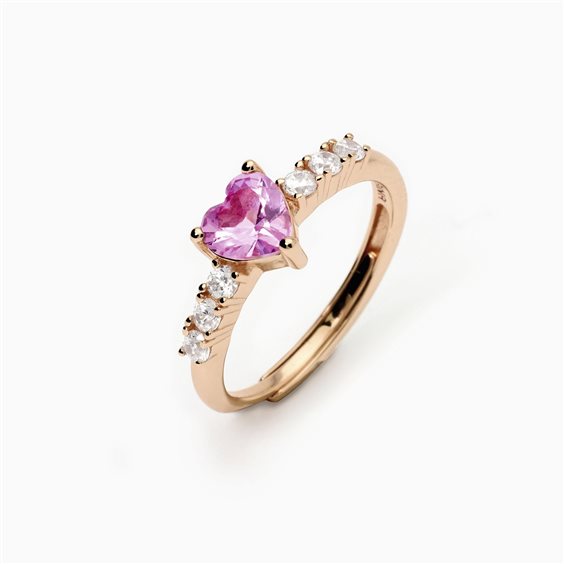 Anello regolabile da donna in argento placcato oro rosa 18K con tormalina sintetica taglio cuore e zirconi bianchi • Incastonatura delle pietre a griffe • Dimensionitormalina sintetica: 6 x 6 mm • Diametro degli zirconi: 2,25 mm • Misura regolabile dalla taglia 11 alla 19 • Materiale: Argento 925,tormalina sintetica, Zircone • Finitura: Placcatura in oro rosa 18k