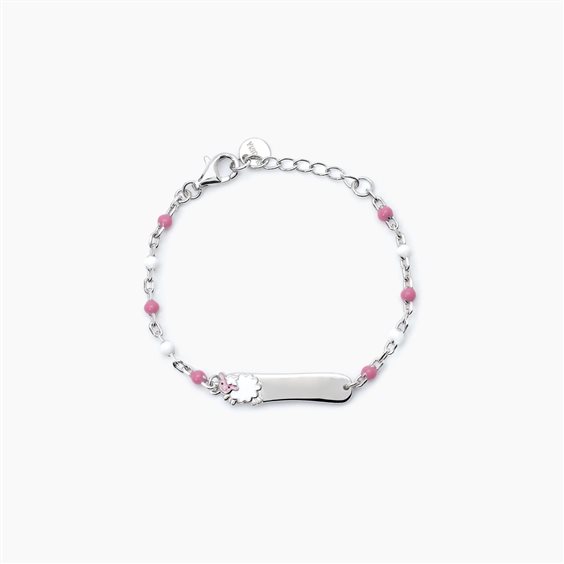 Bracciale neonata in argento con pecorella smaltata e catena rolò con gocce in smalto bianche e rosa. Il bracciale presenta una targhetta centrale sulla quale è possibile incidere date, iniziali o nomi. • Dimensione della piastra: 23 x 5,3 mm • Chiusura con moschettone • Misura regolabile, lunghezza da 12 a 14 cm • Materiale: Argento 925, Smalto