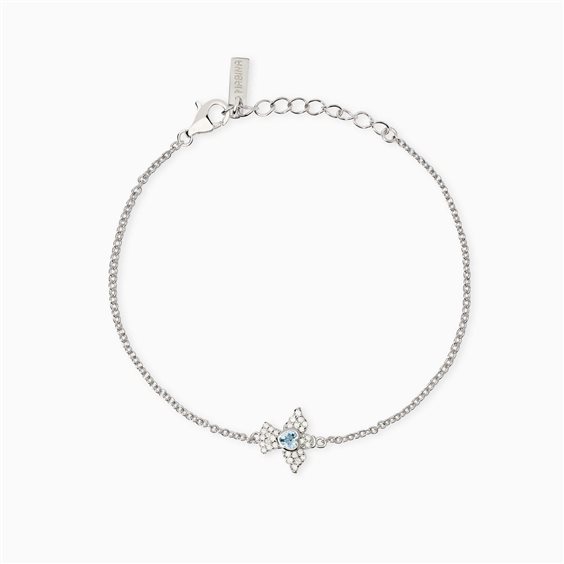 Bracciale regolabile con simbolo angelo Bracciale in argento con catena rolò e forma angelo in zirconi bianchi e cuore in acquamarina sintetica. • Dimensione catena: 1,5 mm • Dimensione angelo: 9,3x10,7 mm • Dimensione acquamarina sintetica: 3x3 mm • Diametro zirconi: 1 e 1,25 mm • Misura regolabile dalla 16 alla 19 cm • Materiale: Argento rodiato 925, Zirconi, Acquamarina sintetica