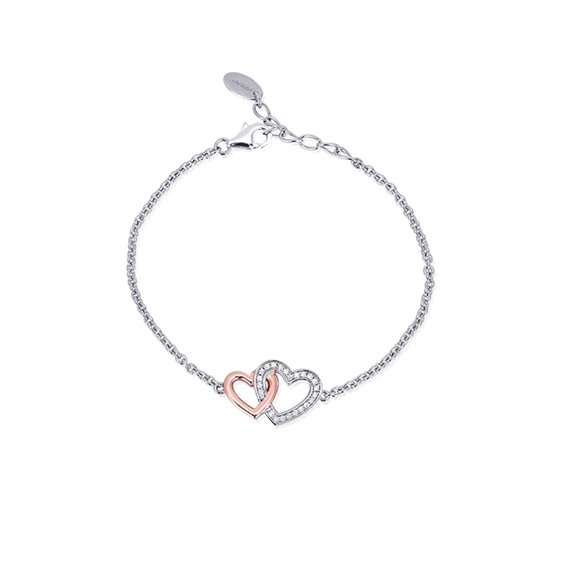 Bracciale donna , argento 925% rodiato , catena maglia rolò , lunghezza cm 19 regolabile fino a cm 16 , doppio cuore centrale , finiture in PVD oro rosè , zirconi bianchi incastonati con griffe. Immagine indicativa , la confezione può variare di forma e colore.