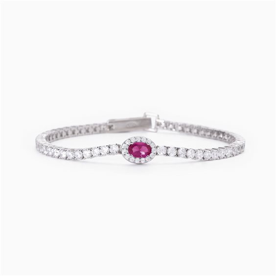 Bracciale argento 925/°°° rodiato con zirconi bianchi Ø 2.5 mm, castone centrale con rubino sintetico taglio baguette 6x4 mm e zirconi bianchi Ø 1 mm, misura M lunghezza 18 cm