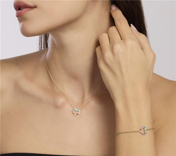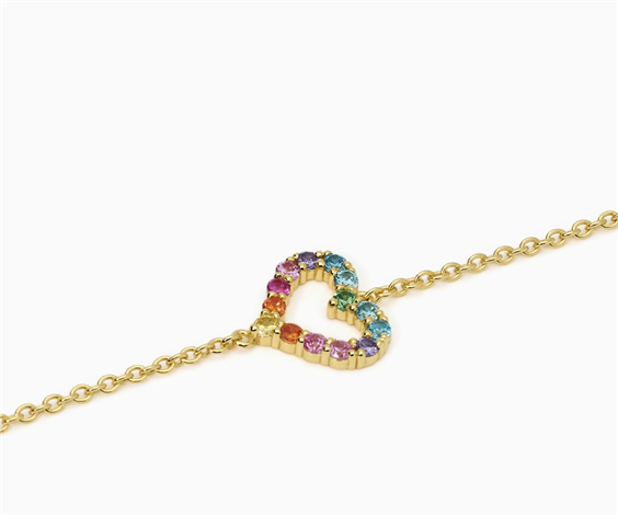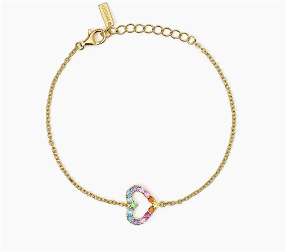 Bracciale regolabile da donna in argento placcato oro giallo 18K con catena forzatina e cuore centrale in zirconi multicolor e tormaline sintetiche rosa. • Larghezza della catena forzatina: 1,5 mm • Dimensioni dell'elemento cuore: 11 x 13,5 mm • Diametro pietre: 2 mm • Misura regolabile, lunghezza da 16 a 19 cm • Materiale: Argento 925,tormalina sintetica, Zircone • Chiusura con moschettone • Finitura: Placcatura in oro giallo 18k
