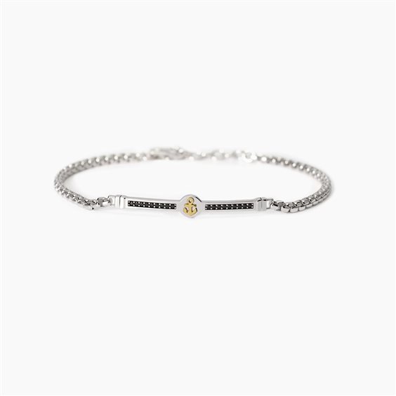 Bracciale in argento rodiato con catena veneta e placca centrale con zirconi neri e simbolo ancora in argento placcato oro 18K. • Dimensione catena: 3 mm • Dimensione placca centrale: 40x6,5 mm • Diametro zirconi neri: 1,25 mm • Misura regolabile, lunghezza da 19 a 21 cm • Chiusura con moschettone • Materiale: Argento rodiato 925, Zirconi • Finitura elementi: Placcatura in oro rosa 18K