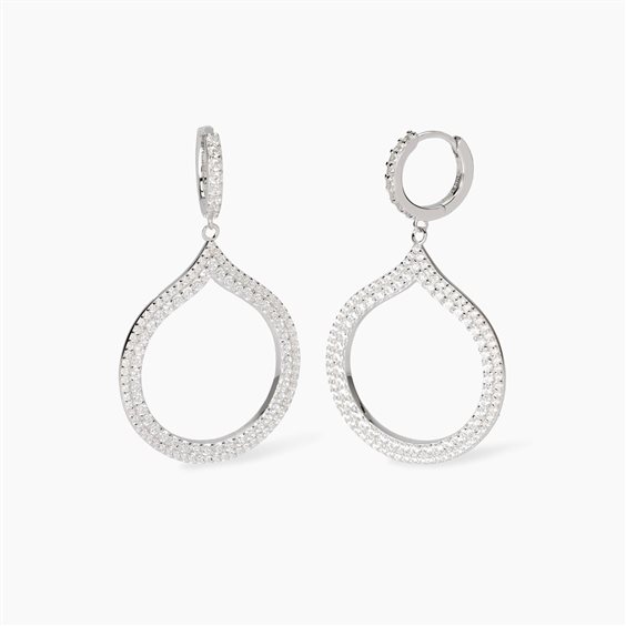 Orecchini a cerchio in argento e zirconi con pendente goccia. • Dimensione pendente goccia: 25,3x29,5 mm • Diametro zirconi: 1 e 1,5 mm • Diametro cerchio esterno: 12,3 mm • Lunghezza totale orecchino: 4,5 cm • Materiale: Argento rodiato 925, Zirconi